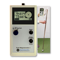The Earth Magnetometer Model EM2 measures the Earth magnetic field with a resolution of 1nT (1 gamma). This resolution is about 0.002% of the typical Earth field strength. It is used to locate buried magnetic objects or materials. • Displays field strength up to 199.999 micro teslas • A relative zero mode subtracts the background field from all subsequent readings so there is only a 1- 2- or 3- digit number to watch. • Backlit display can be turned on. • Lightweight with long battery life (see specifications below). • This is a vector magnetometer so the direction of the field (as well as strength) can be determined (but see full description; this feature requires a longer time per measurement).